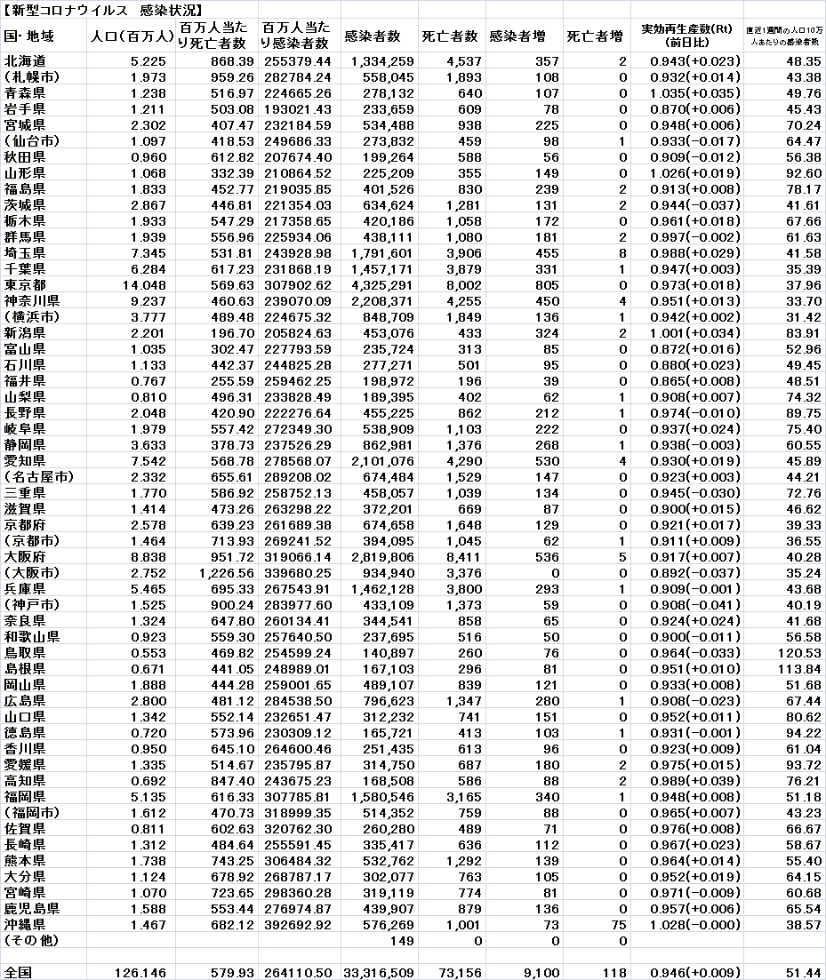新型コロナ致命率(CFR)0.5% というオミクロン株としては異次元の高さになってきている。医療機関の逼迫のせいとも思えないですが、感染の捕捉率が相当落ちてきているのではないかと思われます。 「コロナ終わったムード」の演出が喧しいので、今後ステルスのまま死者が増えていく動きになるのではと