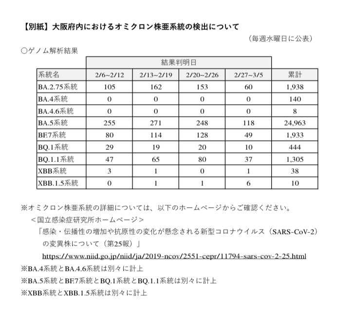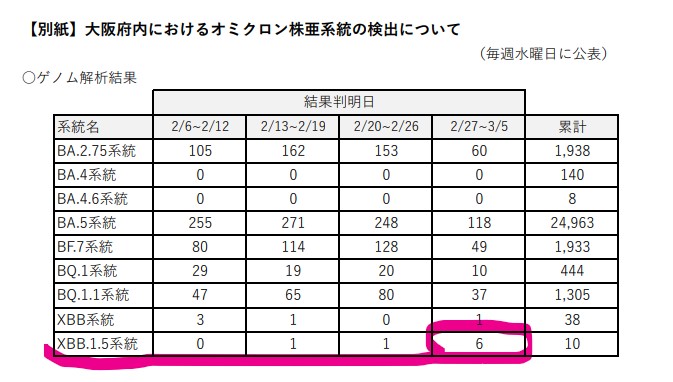 ゲノム解析(オミクロン株亜系統の検出) 2月27日~3月5日結果判明分 🔸XBB.1.5が6件増加。累計10件。 🔸 単純に前週と比較してほぼ他の株は半数以下に減少してるのに、XBB.1.5だけ6倍に増加してますね、もたもたしてる間に。