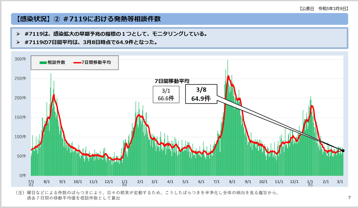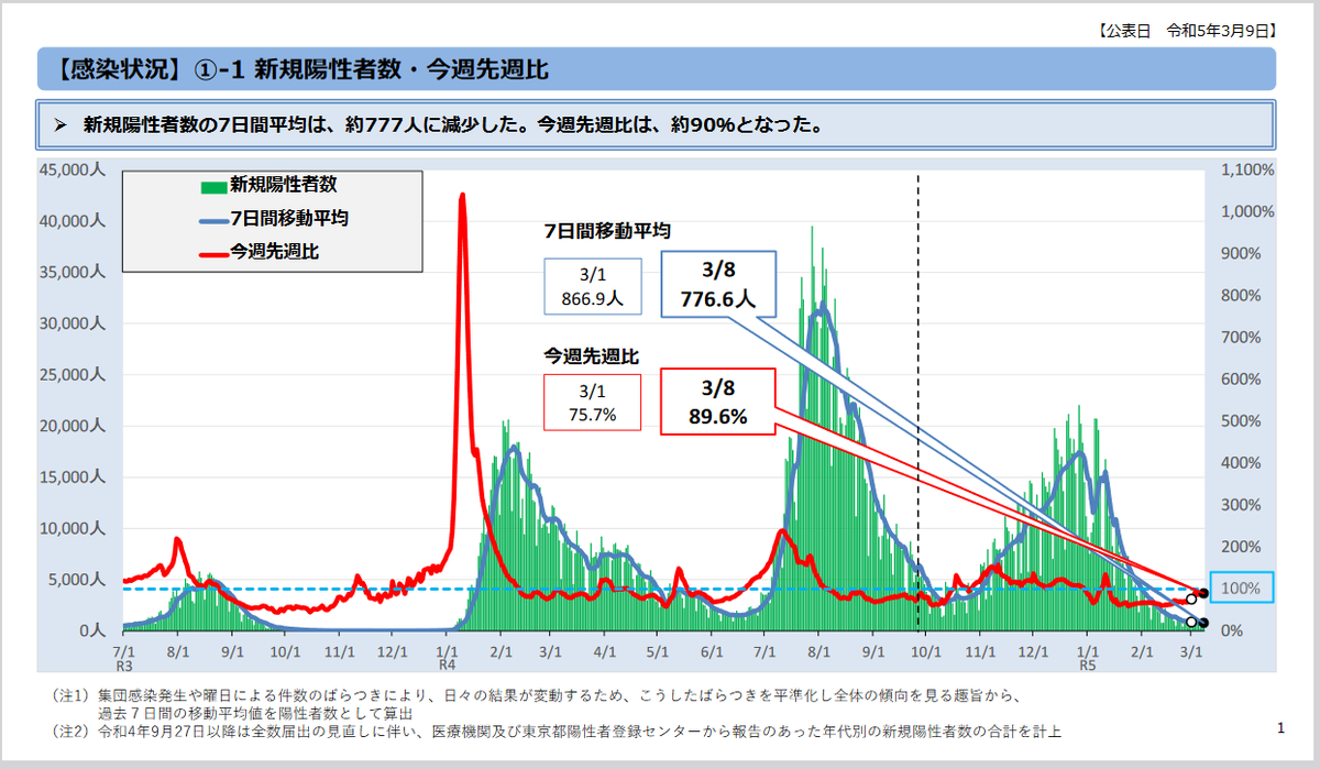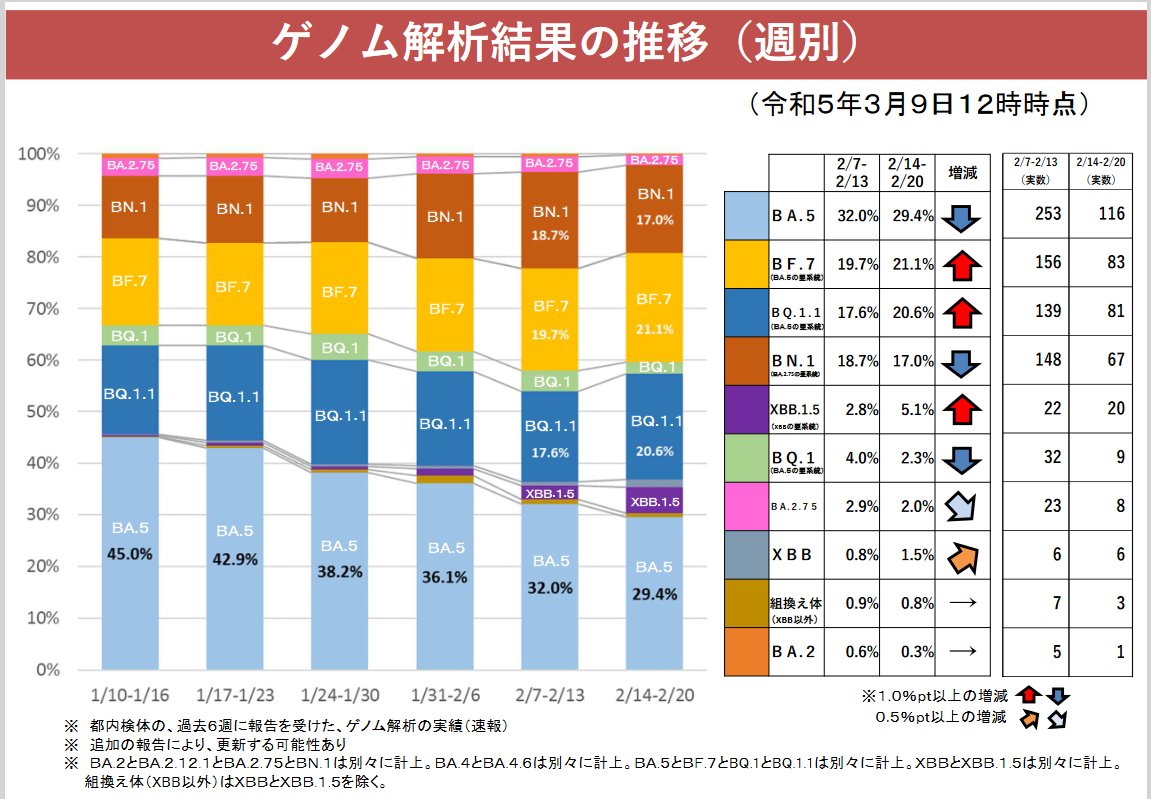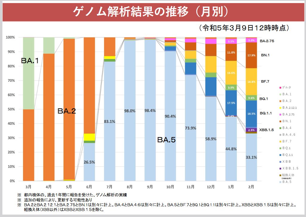 モニタリング項目の分析(令和5年3月9日公表)。東京都の資料みるとオミクロン株の一種XBB.1.5が増えてるけど、感染者数が急増なし。アメリカと違い日本はGWまで日々”全数検査”なので新型コロナウイルス患者が急増するかはすぐわかる。