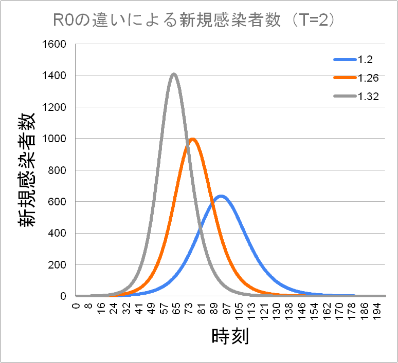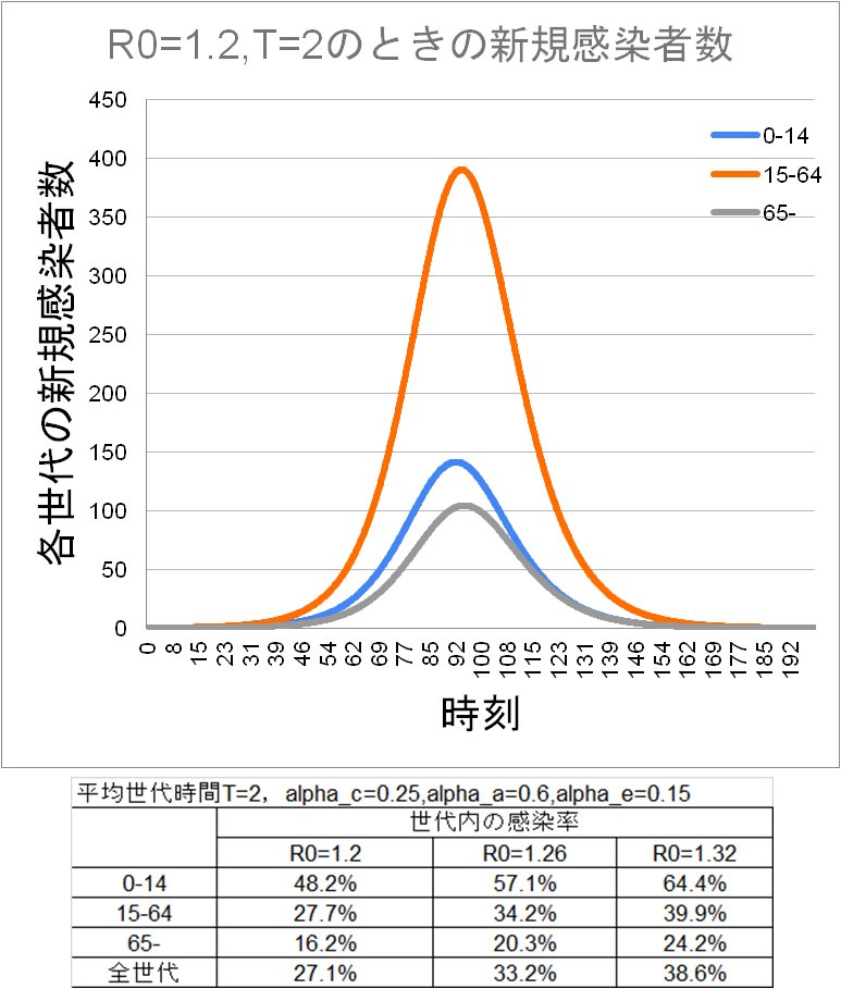 ひとり言。オミクロン株以降でありそうな1つの波を、若年層ほど収束までの感染率が高くなるようにalpha_c,a,eを適当に決めて描いてみました(左図)。カンセンタイサクを緩めてR0が5%と10%上がるとした場合の影響は右図のように計算できました。