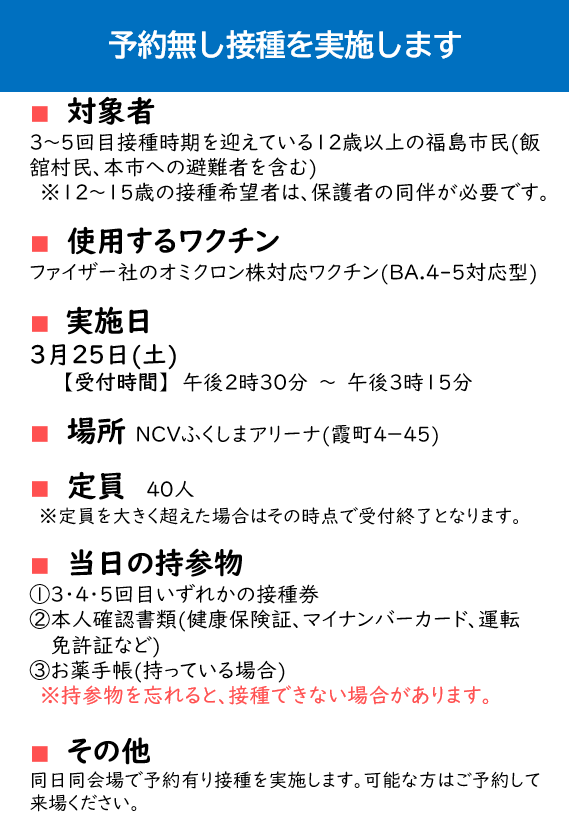 NCVふくしまアリーナ 【新型コロナワクチン3回目以降:予約無し接種を実施します】 予定を立てにくい方が接種を受けやすくするため、オミクロン株対応ワクチンの予約無し接種を実施します。 春からの新生活を迎える前に接種をご検討ください。 ※オミクロン株対応ワクチンの接種は年度内1回のみです。