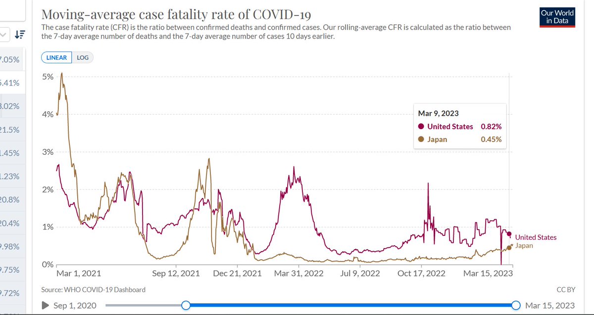 この3年間での世界の致死率は0.01、日本は0.002と、世界の5分の1。オミクロン株の第6・7・8波に限ると、世界は0.012、日本は0.004と世界の3分の1。世界と比べるとやはり日本は軽症で済んでいる。日本の感染者の95%はオミクロン株での感染であることが大きい。中国もほとんどがオミクロンなので軽症