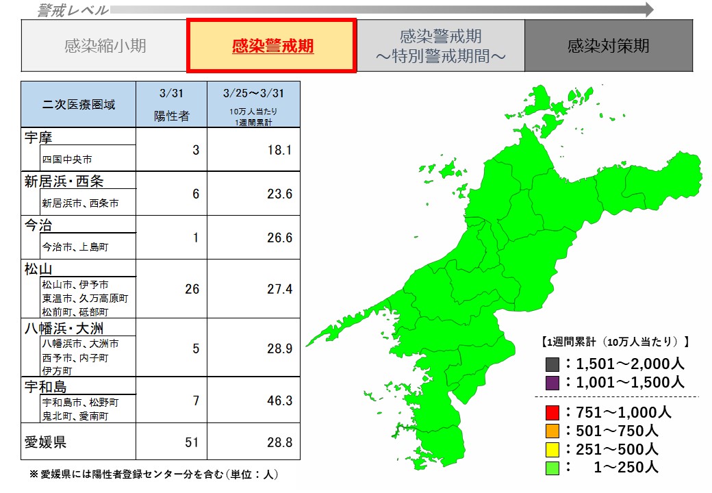 【新型コロナウイルスの医療圏域別の状況(3/31)】 現在、県全域の警戒レベルは「感染警戒期」です。 定期的な換気やこまめな手洗い、効果的な場面でのマスク着用など、一人ひとりが場面に応じた基本的な感染対策を日常化していただくとともに、オミクロン株対応ワクチンの接種をお願いします。