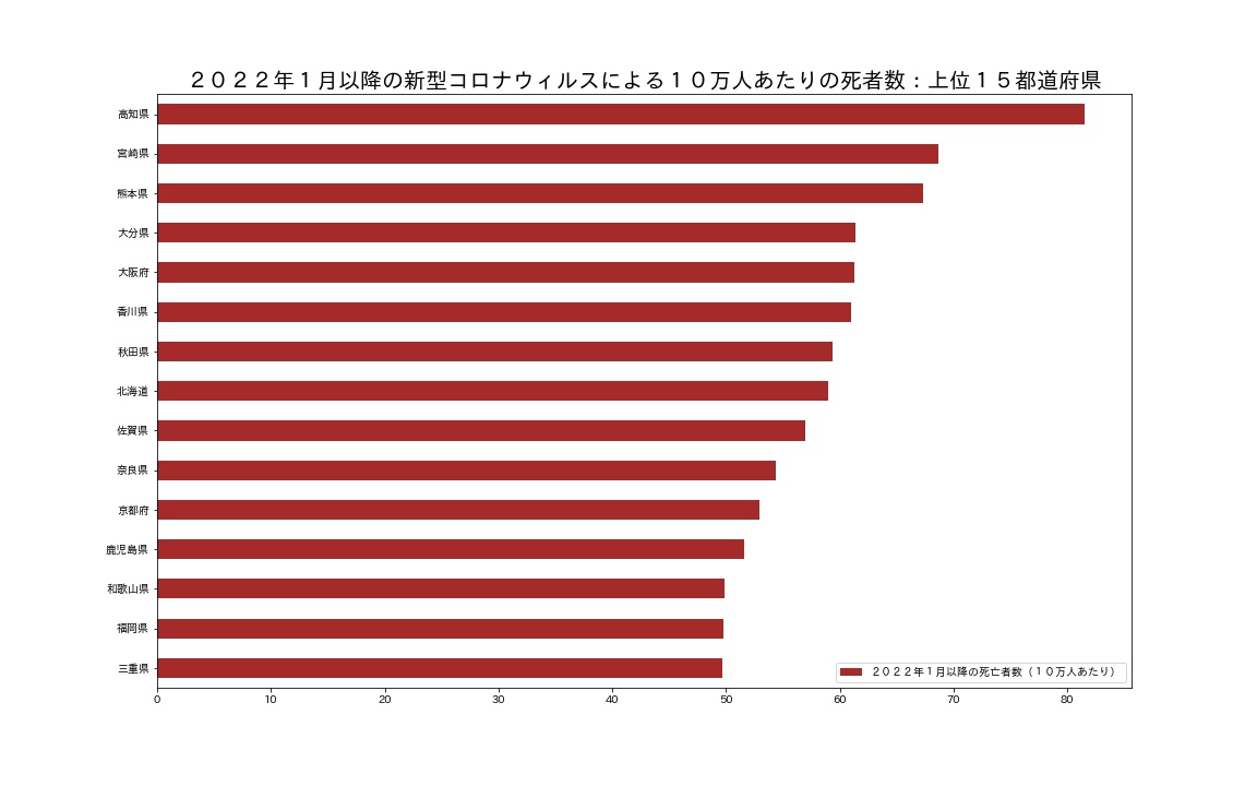 2022年1月(第6波:オミクロン株)以降の死者数 新型コロナウィルスによる10万人あたりの死者数 高知県がトップで81.6人の死者数 宮崎県(68.7人)、熊本県、大分県、大阪府、香川県 以上が60人以上 秋田県、北海道、佐賀県、奈良県、京都府、鹿児島県、和歌山県、福岡県、三重県