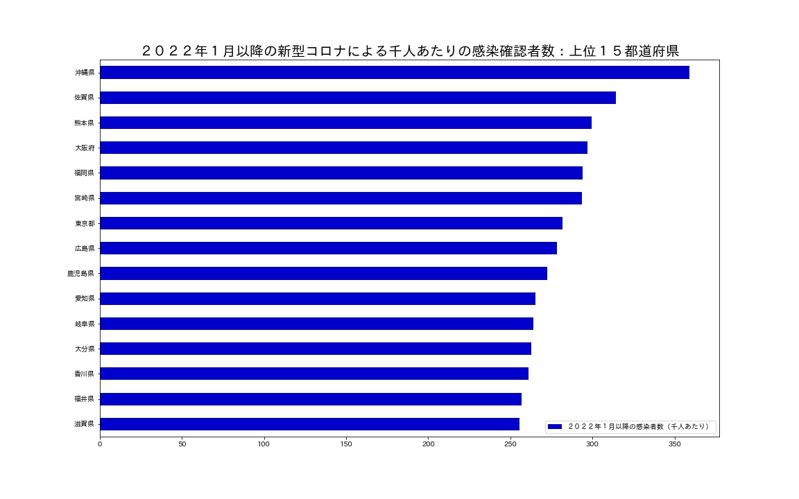 2022年1月(第6波:オミクロン株)以降の感染確認者数 新型コロナウィルスによる千人あたりの感染確認者数 沖縄県がトップで359人 佐賀県(314人)、熊本県、大阪府、福岡県、宮崎県、東京都 以上が280人以上 広島県、鹿児島県、愛知県、岐阜県、大分県、香川県、福井県、滋賀県 の順