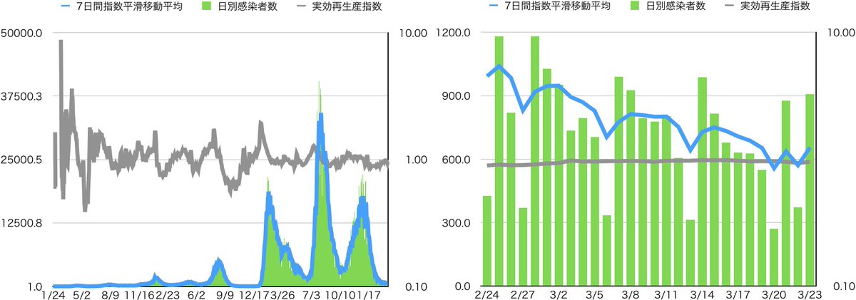 東京都新型コロナウィルス感染者数推移(3/23) 新規感染者数908 Rt0.93→0.95 直近1週間の累計感染者数4235(前週比0.85、人口比0.03%) Rt継続時の感染者数見込み506 前日の異常値を受けてRt反転。