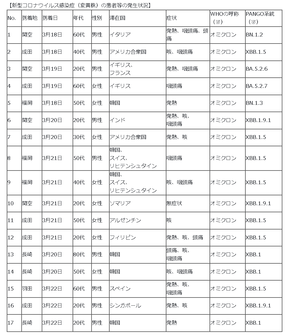 新型コロナウイルス感染症(変異株)の患者等の発生について(検疫)(公表日2023年3月30) 過去の発生状況グラフ 最近はXBBが増えつつある🤔