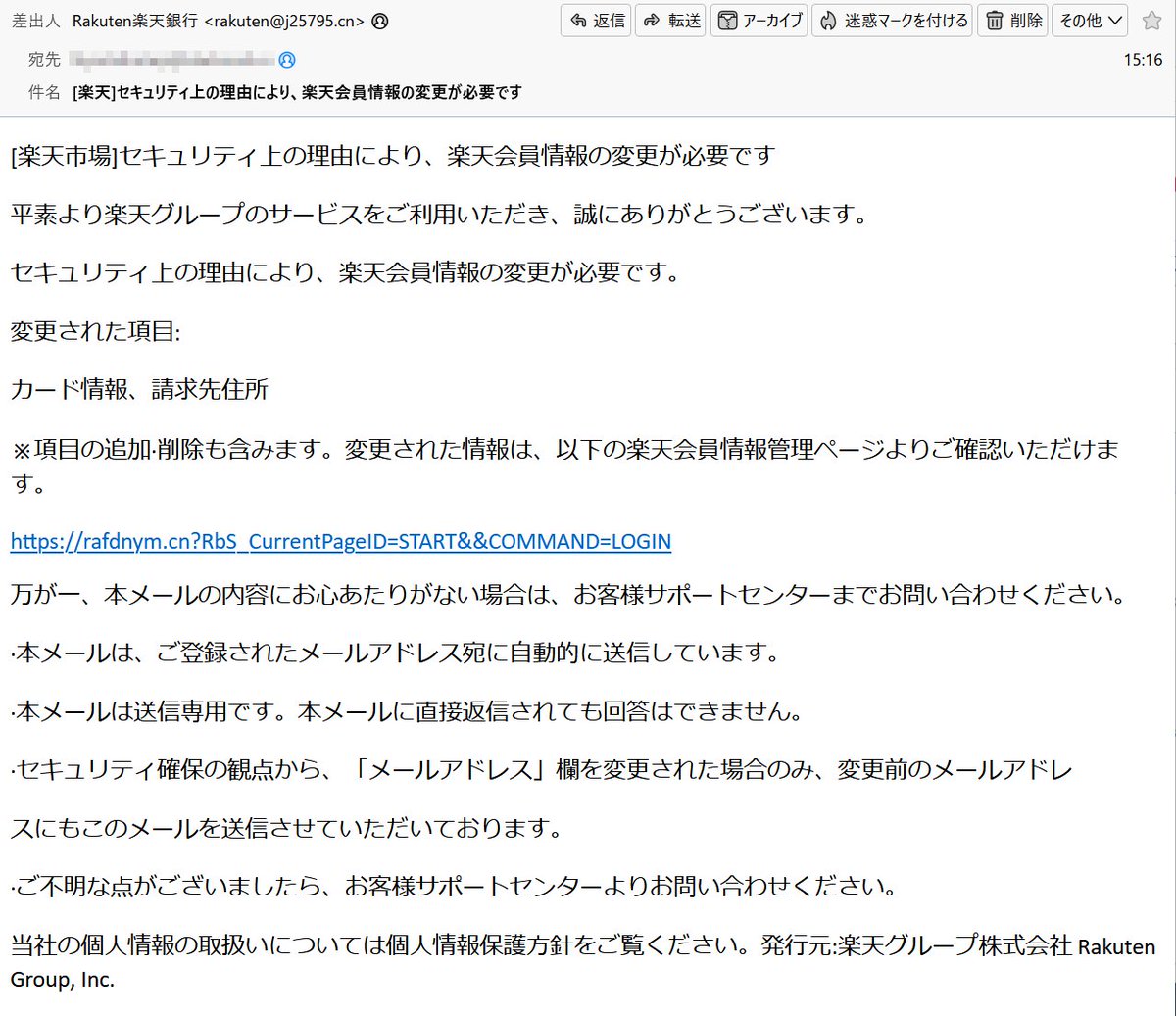 また捨てアドレスに今度は『楽天銀行』騙る迷惑メール📧届いたんだケドさぁ… 差出人のドメインの最後『.cn』て… チャイナ🇨🇳‼️