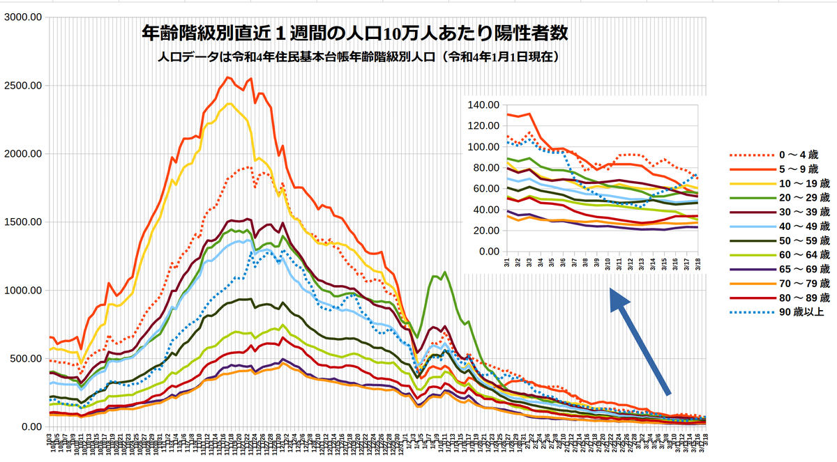 ●北海道の新型コロナウイルス感染者の発生状況 グラフは10月3日~3月18日の直近1週間の人口10万人あたり陽性者数(年齢階級別)の推移 注:非公表・不明の人数は含まれない。2/8公表の人数訂正分は反映済み。 ⚠️90歳以上が増加に転じている